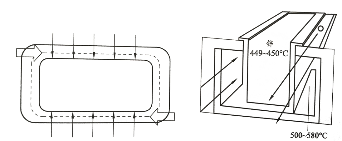一 ﹑鍍(化)鋅爐簡介:高速脈沖鍍鋅爐是各方面性能都很優異的爐型結構。該爐型將出口速度可達 150m/s 的高速燒嘴裝置于鍍鋅爐對角線位置。高速燒嘴出口產生的射吸作用加上脈沖火焰的控制方式,可以大大的提高熱量氣氛的攪拌均勻程度,使之呈輻射狀環繞于鋅鍋外壁,從上至下,從前至后,給鍍鋅爐提供均勻的熱負荷強度,從而提升系統熱效率和鋅鍋使用壽命。